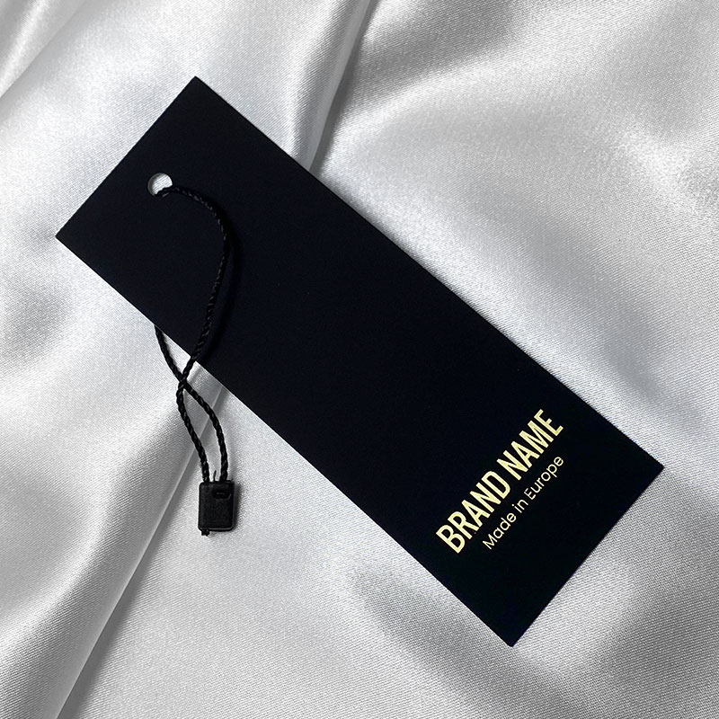 Silt rõivastele või rõivaaksessuaaridele, mis on valmistatud tellimiseks mustast Soft Touch papist, kohandatud hõbedase fooliumiga, millel on kaubamärk või logo. Seda tüüpi riputussilt on valmistatud kvaliteetsetest materjalidest, kasutades digitaalse printimise ja viimistluse valdkonnas kõige arenenumaid tehnoloogiaid.