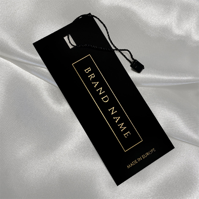 Papist rippuv silt kuldse kirjutise ja musta taustaga, mis on varustatud rõivatoodete nööriga, mis on valmistatud mõlemalt poolt papist paksust Soft Touchist. Seda tüüpi riputussilt on valmistatud kvaliteetsetest materjalidest, kasutades digitaalse printimise ja viimistluse valdkonnas kõige arenenumaid tehnoloogiaid.