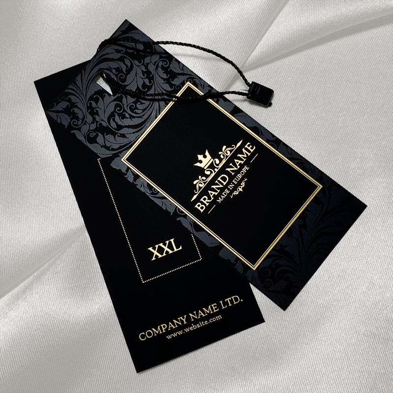 Kaasas on Premium disaini ja pitseriga rõivasildid, millel on must nöör, mis on valmistatud Soft Touch lamineeritud papist ja isikupärastatud kuldfooliumiga kirjutatud. Seda tüüpi riputussilt on valmistatud kvaliteetsetest materjalidest, kasutades digitaalse printimise ja viimistluse valdkonnas kõige arenenumaid tehnoloogiaid.